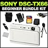 18.2Mp Exmor R CMOS Sensor - 5x Optical Zoom . 3.3" Xtra Fine OLED Display - 4.7-23.5mm Carl Zeiss Vario-Tessar Lens . Optical SteadyShot with Active Mode - 1920 x 1080i HD Video Capture . 3200 ISO - Built-In Flash . Micro HDMI Output .***Included in your SONY DSC-TX66 (White) Digital Camera Beginner Bundle Kit***SONY DSC-TX66 (White)The Sony DSC-TX66 Digital Camera is an 18.2Mp point-and-shoot with a number of things going for it, including superb high definition capture. Capable of capturing 1080/60i movies with dual record of stills and movies, the TX66 is an all-in-one memory making machine. Quality features like a large 3.3" OLED touchscreen, 5x optical and 10x clear image zoom, and a Carl Zeiss Vario-Tessar lens all work hard to provide you with high-quality memories that will last a lifetime.8GB SD (Secure Digital) Memory CardClass 10. High quality and reliability.Home/Car AC/DC ChargerCharge your battery at home and on the road. Smart LED indicator shows charging status.Replacement BatteryLithium-Ion battery for your camera.SD/SDHC Card USB Reader/WriterHigh Speed. Easy plug and play. Use with SD/SDHC/microSD/MS Pro Duo/M2.Memory Card WalletSafe storage for your memory cards.6' HDMI to HDMI Mini CableHigh-Definition signal up to 1080p.6" Mini Tabletop TripodCompact size, three flexible wire legs.Camera Carrying CaseCarrying case. Includes shoulder strap....that's not all...***Also included in your kit***Bottle of Lens Cleaning Solution with 5 Cotton SwabsScratch Safe Cleaning Cloth3 LCD Screen GuardsSqueegee Card