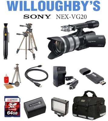 Interchangeable Lens Full HD Camcorder . 16.1 MP Exmor APS HD CMOS Sensor for cinematic HD video . Full HD 1920x1080 up to 24Mbps . CinemaTone presets and 24p native recording for cinematic quality video . High resolution 16.1MP RAW & JPEG still image capture @ 6fps .This DavisMAX Bundle Includes:1- Sony NEX-VG20H Interchangeable Lens HD Handycam Camcorder with 18-200mm F3.5-6.3 OSS Lens Brand New USA w/Supplied Manufacturer AccessoriesPLUS !!! 1- Rechargeable NP-FV100 Extended Life Lithium Ion Replacement Battery (Not Original Sony) (Don't Miss out on a Memory!)1- External Rapid Quick, Travel Charger (Always Have an Extra Battery on Deck!)1- 16GB SDHC Secure Digital Memory Card (Memories are Priceless!)1- 3 Piece Filter Kit Includes: UV, Circular Polarizer and Flourescent Filter and Hard Case1- 0.45x Wide Angle Lens w/ Carry Pouch and Caps1- 2X Telephoto Lens W/Carry Pouch and Caps1- 6 Foot High Performance Mini HDMI Cable1- Full Size 59" Tripod W/Carry Bag (Keep it Steady!)1- Padded Carrying Case (Protect your Investment!)1- Mini Table Top Tripod1- Pack of LCD Screen Protectors (Protect your LCD!)1- Lens/LCD Maintenance Cleaning KitMore about this camera:Unleash your creativity with Sony's new interchangeable lens Handycam camcorder. Featuring a 16.1-megapixel Exmor APS HD CMOS sensor for gorgeous depth of field, this camcorder is in a class of its own. Record 1920x1080/24p AVCHD video with smoother motion, capture DSLR-like photos in RAW and JPG, and capture 5.1-channel audio with the Quad Capsule Spatial Array microphone. To add even more creativity, choose from numerous A- and E-mount lens attachments. For easy framing of your subjects and simple control, the VG20 features a 3-inch touch-panel LCD with TruBlacktechnology for superb contrast and reduced glare. Supplied manufacturer accessories:AC E-Mount 18-200mm f/3.5-6.3 Zoom Lens for NEX CameraAC AdapterNP-FV70 Rechargeable Camcorder Battery Pack (2060mAh, 8.4V)Wind ShieldLens HoodLens CapUSB CableCD-ROM with PC ApplicationsRemote 1 Year Limited USA Warranty